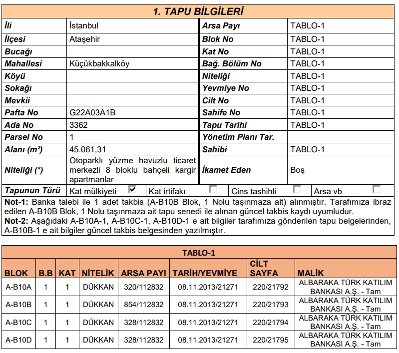 İstanbul İli, Ataşehir İlçesi, Küçükbakkalköy Mahallesi, 3362 Ada, 1 Parselde kayıtlı, ana taşınmazı 45.061,31 metrekare yüzölçümlü olan, Otopaklı Yüzme Havuzlu Ticaret Merkezli 8 Bloklu Kargir Apartmanlar nitelikliana taşınmaz üzerinde bulunan;