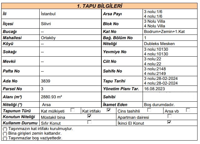 ADRES: ORTAKÖY MAHALLESİ, SULUCA SOKAK, VİLLA NO: 24C (3 NOLU), VİLLA NO 24 D( 4 NOLU) SİLİVRİ / İSTANBUL